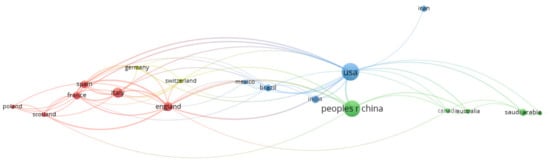 The leading countries in the analyzed researched were the USA (76 studies, 3751 citations), China (67 studies, 3426 citations), Turkey (41 studies, 90 citations), Italy (26 studies, 493 citations), England (21 studies, 946 citations), and France (14 studies, 727 citations). The rank of the countries is detailed in Table 1, while Figure 3 highlights the country/region co-authorship network.