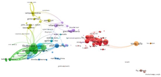 VOSviewer network visualization map of authors (type of analysis: citation, weights—citations, minimum number of documents of an author—2399 authors meet the threshold, largest set of connected items—396 sources).