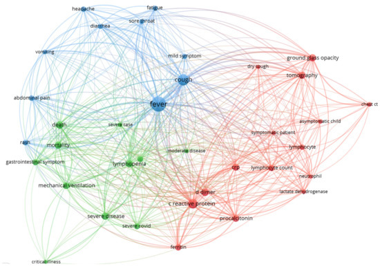 VOSviewer network visualization map of keywords (author keywords and keywords plus)—symptoms and laboratory related keywords (encountered minimum 10 times). A more detailed figure is Supplementary Figure S1 where, from the total number of 645 keywords, 160 were encountered a minimum 2 times.