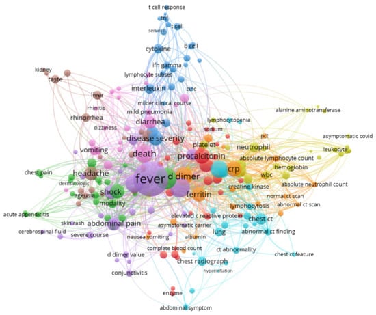 VOSviewer network visualization map of terms, from title and abstract—symptoms and laboratory related keywords (encountered a minimum of 2 times). A more detailed figure is Supplementary Figure S2 where, from the total number of 6466 terms, 242 were encountered a minimum of 10 times.