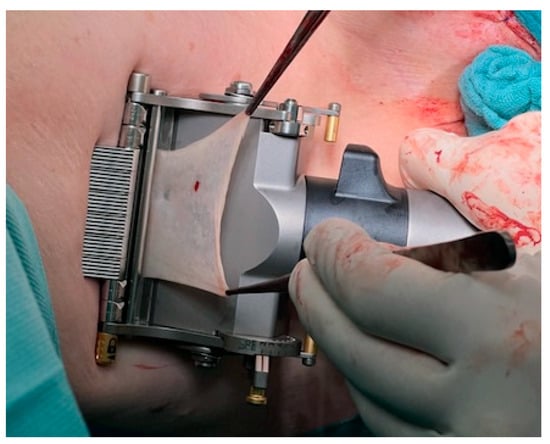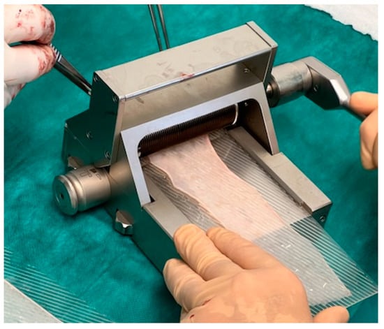 The skin transplant has to be cut thinly enough to ensure that no hair follicles remain in the harvest. Usually a thickness of 0.1–0.2 mm is sufficient. No tendency of curling of the transplant and semitransparency are intraoperative signs that the thickness seems to be correct. After meshing the split-skin transplant with a dermatome, the surface enlarges about 50–100%, and this should guarantee a surface of about 100–120 cm2 (see Figure 4).