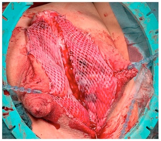 The meshed skin graft has several advantages besides gaining more tissue surface. It provides optimal adaption of the harvest on the mainly uneven recipient bed and optimal drainage conditions for wound secretion and smaller bleedings. This circumstance seems to be the most important reason for successful healing in the first postoperative phase because it guarantees a good neovascularization of the transplant. In case of the retention of wound secretions and blood, a neovascularization cannot occur in the right way and results in the shrinkage and restructuring of the neourethra []. This can often be observed in closed full-thickness skin patches, which are only perforated instead of meshed [,].