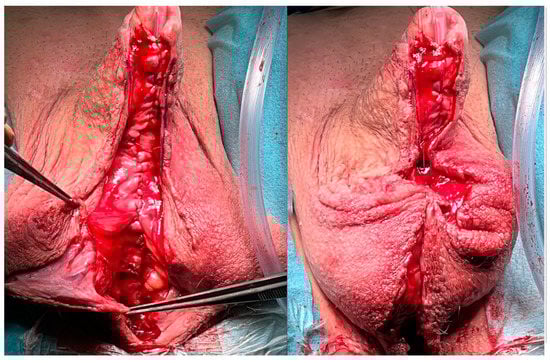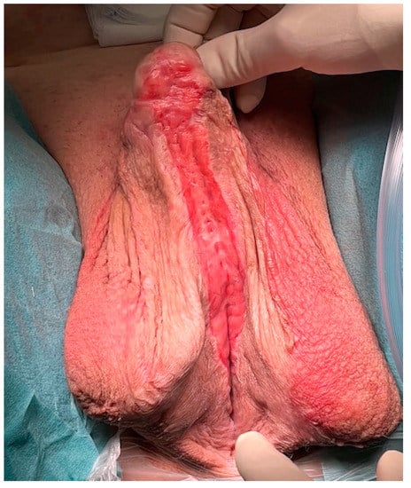 The laterally fixed scrotal skin during the first procedure is dissected again, and the normal anatomy is reconstructed by approximating the two scrotal skin halves in the midline to reproduce a raphe (Figure 10).