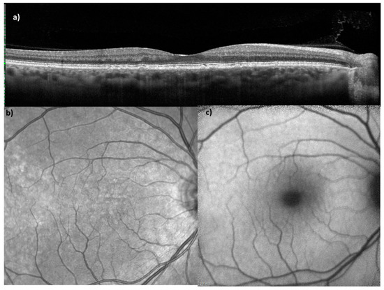 Multimodal imaging of a SLE patient with drusen-like deposits. (a) Illustrates an optical coherence tomography scan, (b) a near-infrared (NIR) image, and (c) a fundus autofluorescence image.