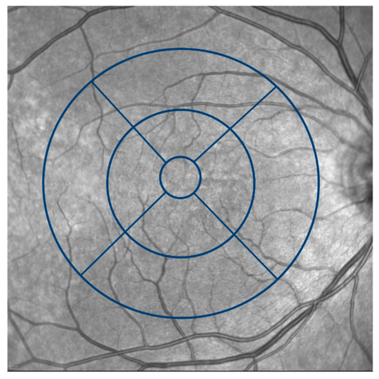 Grid for retinal layer thickness measurement. Retinal layer thickness was measured according to the ETDRS grid that was divided into a central area including the fovea with a diameter of 1mm, an inner ring with a diameter of 3mm, and an outer ring with 6 mm.