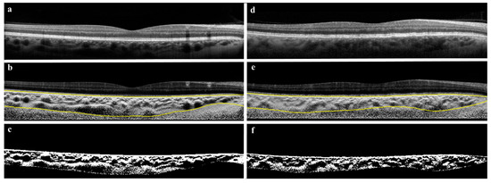 Choroidal vascularity index (CVI). CVI data was generated from OCT cross-sections (a,d) through automatic segmentation (b,e) and binarization (c,f). Pictured is a SLE patient without DLD (left column) and a SLE patient with DLD (right column).
