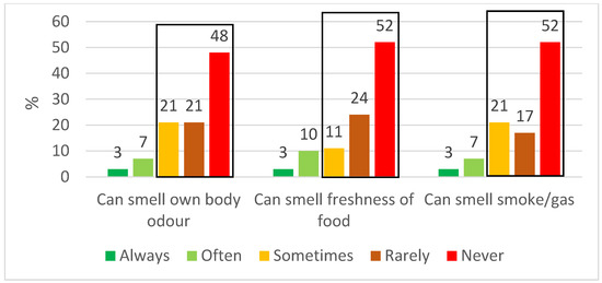 HRQoL; patients’ ability to navigate everyday life using their sense of smell and taste 3–6 months after hospitalisation for COVID-19 (n = 29). The black box shows the percentage of patients where this ability was decreased.