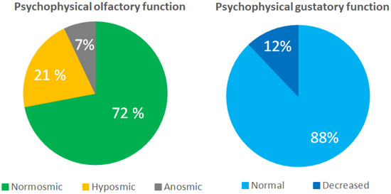 - Tong, J.Y.; Wong, A.; Zhu, D.; Fastenberg, J.H.; Tham, T. The Prevalence of Olfactory and Gustatory Dysfunction in COVID-19 Patients: A Systematic Review and Meta-analysis. Otolaryngol. Head Neck Surg. 2020, 163, 3–11. [Google Scholar] [CrossRef]