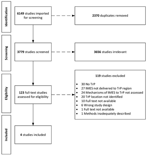 Three of the included studies assessed the effects of IMES to TrPs on individuals with MPS [49,50,51]. Upper trapezius TrPs were treated in two studies [50,51], one study treated TrPs in either the levator scapulae or upper trapezius [49]. Only one study used an animal model and investigated IMES to the levator auris longus muscle in a TrP that was generated by subcutaneous injection of neostigmine [52].