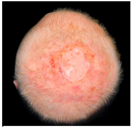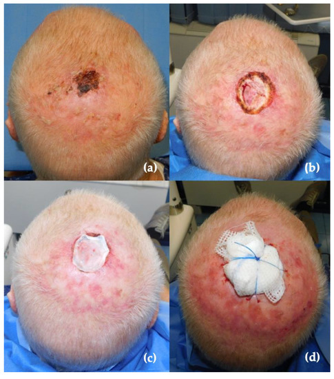 - Corradino, B.; Di Lorenzo, S.; Leto Barone, A.A.; Maresi, E.; Moschella, F. Reconstruction of full thickness scalp defects aftertumour excision in elderly patients: Our experience with Integra® dermal regeneration template. J Plast Reconstr Aesthetic Surg. 2010, 63, e245–e247. [Google Scholar] [CrossRef] [PubMed]