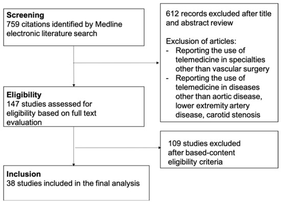 The MEDLINE database was independently searched by two authors (JR, FL) to identify studies reporting applications of telemedicine in vascular surgery and specifically focusing on three main vascular pathologies: aortic disease, LEAD and carotid stenosis. A combination of keywords was used, including “telehealth”, “telemedicine”, “vascular surgery”, “aortic”, “peripheral artery disease”, ‘lower extremity artery disease” and “carotid”. Only original articles published in the English language were included. After titles were identified, the abstracts were checked and full texts were retrieved. Exclusion criteria were studies that specifically focused on the use of telemedicine in diseases other than carotid, aortic or LEAD, or that reported the use of telemedicine in specialties other than vascular surgery. Eligibility was independently checked by two authors (JR, FL). In case of disagreement, the article was discussed with other authors to reach a consensus. The selection flow chart is depicted in Figure 1.