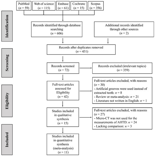 A total of 606 studies and 2 grey studies were retrieved and 431 studies remained after the removal of duplicates. After screening of titles and abstracts, 359 articles were excluded for irrelevant topic, 8 for using artificial grooves instead of extracted human teeth, 21 for reviews or meta-analysis and 1 for not being written in English. The remaining 42 articles were screened and evaluated by two reviewers independently. In total, 27 studies were further excluded for the following reasons: 3 for lacking comparison and 24 for using SEM or histological methods for evaluation rather than Micro-CT. Finally, eleven studies were included for meta-analysis [15,29,35,36,37,38,39,40,41,42,43]. The literature screening process is shown in Figure 1. References listed in the eligible articles were examined and no additional eligible studies were identified.