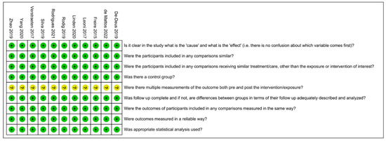 Risk-of-bias summary. Green: low risk of bias; Yellow: unclear risk of bias [15,29,35,36,37,38,39,40,41,42,43].