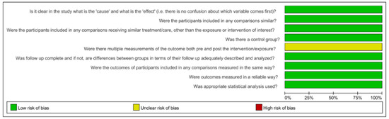 The assessment of risk of bias is shown in Figure 2 and Figure 3 [15,29,35,36,37,38,39,40,41,42,43]. All 11 included studies were classified as having a low risk of bias, with an average score of 88.90%. All studies made the intervention and outcomes clear. No samples in any included studies received similar treatment other than the intervention of interest. All studies have a group treated by PUI as a control group. No study mentioned if multiple measurements of the outcome were conducted before and after the irrigation.