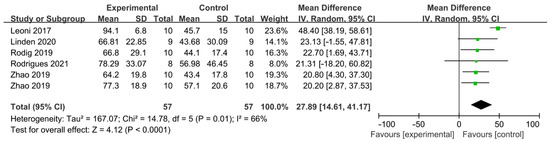 The difference in cleaning efficacy between PUI and SNI was reported by five articles as shown in Figure 4 [35,36,37,39,42] and a total of 114 teeth was included. Each study included one comparison, except Zhao, which included two independent comparisons. PUI showed better AHTD removal effect than SNI (WMD: 27.89, 95% CI: 14.61 to 41.17; p < 0.0001) with significant between-study heterogeneity (χ2 = 14.78, df 5, p = 0.01, I2 = 66%). No publication bias was detected by Begg’s test (p = 0.75).
