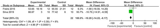 Comparation of EndoVac and PUI was available in two studies and 44 teeth were involved totally (Figure 5) [29,38]. EV was found to be less effective than PUI regarding to AHTD removal (WMD: −10.20, 95% CI: −14.22 to −6.17; p < 0.00001) and no significant heterogeneity between studies was found (χ2 = 1.09, df 1, p = 0.30, I2 = 8%). There was evidence of publication bias detected by Begg’s test (p < 0.01).