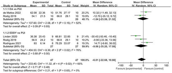 The difference in cleaning efficacy between SAI and PUI was reported by four studies (Figure 6) [35,36,39,43]. The overall effect showed no significant difference between the two groups (WMD: −6.01, 95% CI: −22.68 to 10.66; p = 0.48). Additionally, a subgroup analysis indicated no significant difference between EA and PUI (WMD: −1.04, 95% CI: −23.59 to 21.52; p = 0.93), ED and PUI (WMD: −9.06, 95% CI: −35.20 to 17.08; p = 0.50), while a better outcome trend was found in the PUI than SAI group. There was significant between-study heterogeneity (χ2 = 11.32, df 4, p = 0.02, I2 = 65%). No publication bias was detected by Begg’s test (p = 0.73).