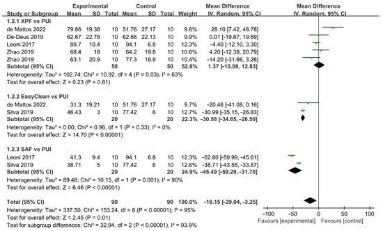 A total of five studies described the comparison of the mechanical-activated system and PUI (Figure 7) [37,38,40,42,43]. Five articles with 180 teeth investigated the difference in the effect of AHTD removal between mechanical-activated system and PUI. Zhao included two independent comparisons and each of the other studies included one comparison. Mechanical-activated irrigation system was found to be less effective than PUI and there was statistically significant difference between these two groups (WMD: −16.15, 95% CI: −29.04 to −3.25; p = 0.01). A subgroup analysis based on mechanical instruments was carried out. The cleaning efficacy of PUI significantly surpassed EasyClean (WMD: −30.58, 95% CI: −34.65 to −26.50; p < 0.00001) and SAF (WMD: −45.49, 95% CI: −59.29 to −31.70; p < 0.00001), while the difference between XPF and PUI was not significant (WMD: 1.37, 95% CI: −10.08 to 12.83; p = 0.81). There was a significant between-study heterogeneity the in subgroup of XPF vs. PUI (χ2 = 10.92, df 4, p = 0.03, I2 = 63%) and subgroup of SAF vs. PUI (χ2 = 10.15, df 1, p = 0.001, I2 = 90%), and no significant heterogeneity between studies was found in the subgroup of EC vs. PUI (χ2 = 0.96, df 1, p = 0.33, I2 = 0%). No publication bias was detected by Begg’s test (p = 0.94).