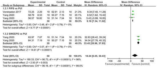 Comparation of percentage reduction in AHTD between LAI and PUI was reported by two studies, with a total of 100 teeth involved (Figure 8) [15,41]. One comparison was included in Verstraeten and two independent comparisons were conducted in Yang. The irrigation efficacy significantly increased in LAI compared with that in PUI (WMD: 18.24, 95% CI: 6.05 to 30.43; p = 0.003). A subgroup analysis based on laser-activated instruments was carried out. The cleaning efficacy of PIPS (WMD: 9.18, 95% CI: 7.34 to 11.02; p < 0.00001) and SWEEPS (WMD: 33.45, 95% CI: 28.96 to 37.93; p < 0.00001) significantly surpassed PUI and SWEEPS, demonstrating the superior efficacy of AHTD removal compared to PIPS. No significant heterogeneity between studies was found in subgroups (χ2 = 0.48, df 2, p = 0.79, I2 = 0%; χ2 = 0.07, df 1, p = 0.79, I2 = 0%) and no publication bias was detected by Begg’s test (p = 0.24).