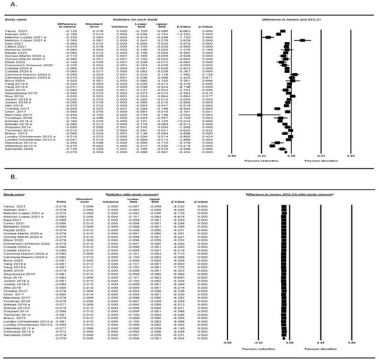 (A) Forest plot displaying standardized mean difference and 95% confidence intervals showing the consequence of bariatric surgery on IMT [16,32,33,34,35,36,37,38,39,40,41,42,43,44,45,46,47,48,49,50,51,52,53,54,55,56,57,58,59,60]; (B) Leave-one-out sensitivity analyses indicating the effect of bariatric surgery on IMT [16,32,33,34,35,36,37,38,39,40,41,42,43,44,45,46,47,48,49,50,51,52,53,54,55,56,57,58,59,60].