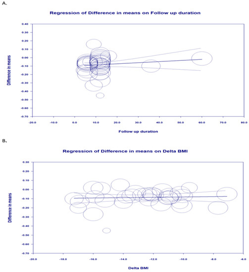 Random-effects meta-regression for evaluating the effect of: (A) delta BMI; (B) follow-up duration.