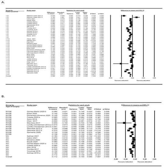 A subgroup analysis was also performed based on surgery type and treatment duration (<12 months and ≥12 months). The subgroup analyses demonstrated significant associations between surgery types and IMT changes (p < 0.001). The improvement of IMT in patients who had laparoscopic sleeve gastrectomy (LSG) surgery was better than in those who had Roux-en-Y gastric bypass (RYGB). Furthermore, a significant effect of follow-up duration on the changes of IMT after bariatric surgery was observed with further improvement in IMT in the follow-up period of less than 12 months (Figure 4A,B).