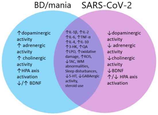 Convergence of disorders caused by SARS-CoV-2 and factors contributing to the development and course of BD/mania. Disorders inside the common part of both circles coincide with each other the most. Disorders outside the common part of the circles are different, inconclusive or inconsistent (explained in the main text). Abbreviations: ↑—increased concentration/activity; ↓—decreased concentration/activity; 3-HK—3-hydroxykynurenine; 5-HT—serotonin; BD—bipolar disorder; BDNF—brain-derived neurotrophic factor; GABA—γ-Aminobutyric acid; HPA—hypothalamic-pituitary-adrenal; IL-1β—interleukin-1β; IL-2—interleukin-2; IL-4—interleukin-4; IL-6—interleukin-6; IL-10—interleukin-10; LPO—lipid peroxidation; QA—quinolinic acid; ROS—reactive oxygen species; TAC—total antioxidant capacity; TNF-α—tumor necrosis factor α; WM—white matter.