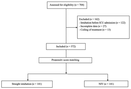 After propensity score matching, 141 patients were included in the “straight” intubation group and 141 patients in the NIV group. (Figure 1) Beyond weighted variables, no significant differences in demographic, clinical characteristics and respiratory parameters at ICU admission between groups were observed, except for a greater PaCO2 in the “straight intubation” group, compared to the NIV group (38.00 [34.00–45.00] vs. 36.00 [32.00–41.00] mmHg, respectively; p = 0.04) (Table 1).