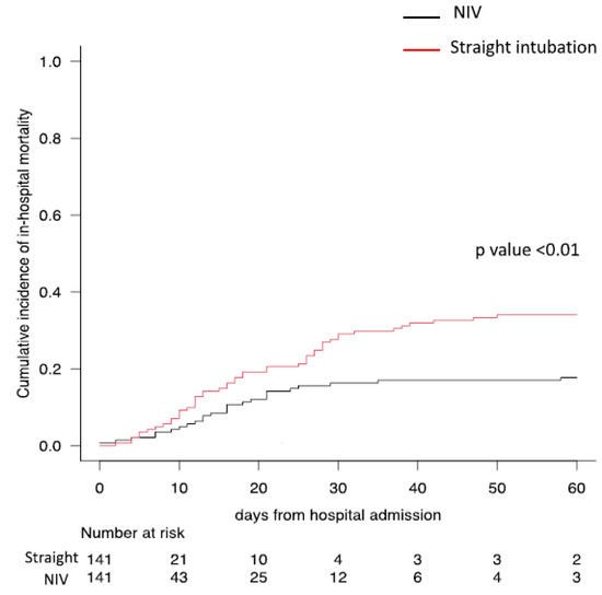 Difference in cumulative incidence of in-hospital mortality between straight intubation and NIV patients.