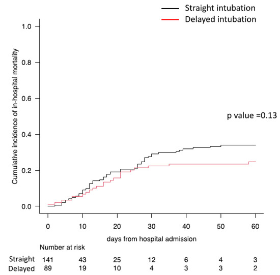 Difference in cumulative incidence of in-hospital mortality between straight and delayed intubation.