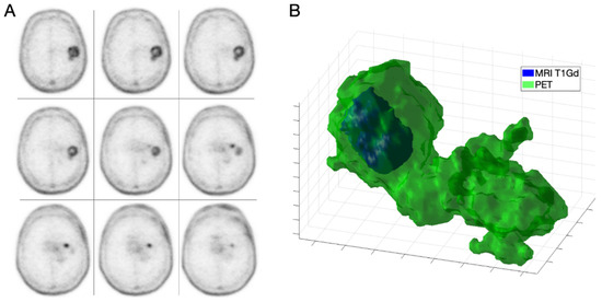 IDH-wt high grade GBM in a 68-year-old male (patient 1). Axial slices of 18F-fluorocholine PET (A) and combined three-dimensional representation of segmented tumor on MRI T1-Gd and PET (B) with total volumes of 3.97 and 36.45 mL, respectively.