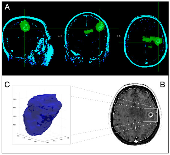 Three-dimensional corregistration of MRI T1-Gd with 18F-Fluorocholine PET for the same patient as in Figure 1. Axial, coronal and sagittal slices representative of PET (green) and CE-MRI (light green) (A) Representative axial slice of CE-MRI (B). Three-dimensional representation of segmented CE-tumor on MRI (C).