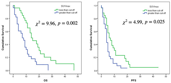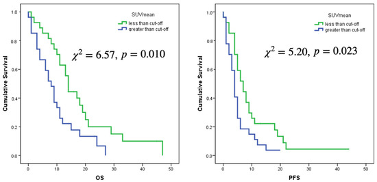 Log rank curves for OS and PFS for a cut-off of SUVmax of 3.56 and a cut-off of SUVmean of 1.25.