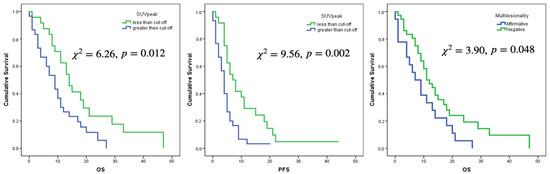 Only the selected cut-offs of SUVmax, SUVpeak and SUVmean showed significant association with OS. Log rank curves for OS and PFS are shown in Figure 3 and Figure 4. Metabolic multilesionality was also a predictor of OS (Figure 4).