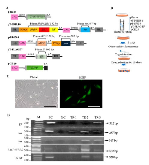 PB-based expression vectors (Figure 1A) were constructed using a standard cloning procedure. pTrans [] is a vector for the expression of PB transposase under the control of the chicken β-actin (CAG) promoter []. pT-bFN-3 is a PB-based vector that carries a bFGF expression unit under the control of the CAG promotor and a neomycin resistance gene (neo) expression unit under the control of the mouse phosphoglycerate kinase (Pgk) promoter. pT-PBILB-4 is a PB-based vector that carries a BMP4/LIF expression unit under the control of the mouse Pgk promoter and a blasticidin S-resistance gene (bsr) expression unit under the control of the CAG promoter. BMP4/LIF expression is mediated by the internal ribosome entry site, a multicistronic element enabling CAP-independent protein translation []. pT-FLAG-E7 is a PB-based vector that carries a bovine papilloma virus-derived E7 expression unit under the control of the CAG promoter. E7 is an immortalization gene responsible for continuous cell proliferation. pCE-29 [] is a plasmid vector for the expression of enhanced green fluorescent protein (EGFP) cDNA under the control of the CAG promoter. All plasmids were grown in E. coli DH5α and purified using a Macherey-Nagel plasmid purification kit as previously described [].
