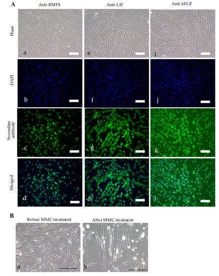 - Kim, G.H.; Lee, G.R.; Choi, H.I.; Park, N.H.; Chung, H.T.; Han, I.S. Overexpression of Bone Morphogenetic Protein 4 in STO Fibroblast Feeder Cells Represses the Proliferation of Mouse Embryonic Stem Cells In Vitro. Exp. Mol. Med. 2012, 44, 457–463. [Google Scholar] [CrossRef][Green Version]