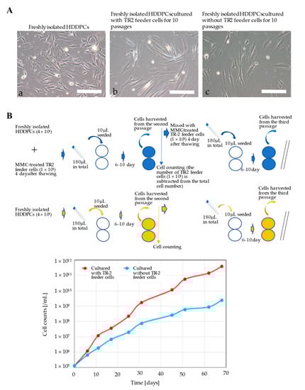 Our findings show that co-cultivation of primary HDDPCs with MMC-treated TR-2 feeder cells can maintain the integrity of primary HDDPCs, including proliferation rate, differentiation ability, and expression of stemness markers. As TR-2 feeder cells express growth factors that are potentially beneficial for maintaining juvenile cells, such as stem cells, progenitor cells, and ESCs/iPSCs, they may be useful for maintaining other types of juvenile cells that are difficult to maintain in the absence of feeder cells or require specific growth medium.