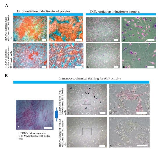 Notably, HDDPCs obtained after 1–4 passages often showed unstable growth rates, possibly due to the various types of cells included with the HDDPCs. After culturing in the conditions used in this study, HDDPCs retained stem-like properties even after 10 passages [], and exhibited stable growth rates []. The growth assay shows that, after 10 passages, HDDPCs co-cultured with TR-2 feeder cells had a higher proliferation rate than those cultured without TR-2 feeder cells (Figure 3B). HDDPCs cultured with TR-2 feeder cells had better differentiation potential than those cultured without TR-2 feeder cells (Figure 4A), indicating that GM human feeder cells are important for maintaining the integrity of primary cultured HDDPCs. Continuous culture of primary HDDPCs in feeder-less medium resulted in a loss of ALP activity (Figure 4B), indicating a loss of stem cells (initially included in the isolation of HDDPCs). A previous study showed that primary HDDPCs comprise various cells, including stem and non-stem cells []. As ALP and OCT-3/4 are markers of ESCs/iPSCs [,,], ALP(−)/OCT-3/4(−) cells may be considered non-stem cells, whereas ALP(−)/OCT-3/4(+), ALP(+)/OCT-3/4(−), and ALP(+)/OCT-3/4(+) cells may be considered stem cells []. This study indicates that the secretion of growth factors from TR-2 feeder cells may be beneficial for stem cell survival. Notably, expression of CD73, CD90, and STRO-1, all of which are recognized as markers for mesenchymal stem cells (MSCs), has been reported in HDDPCs []. Unfortunately, we did not test for expression of these proteins in the HDDPCs used in the present study. HDDPCs should be comprehensively checked for the expression of stem-cell-specific markers, including MSC-related markers, in future studies.