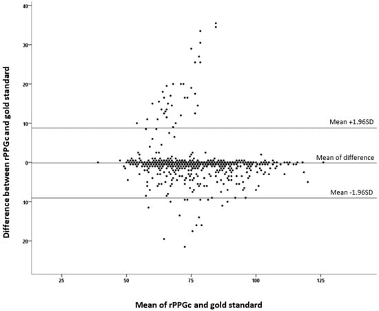 A Bland–Altman plot was applied to analyse the accuracy between the two measurement systems at 60 s (rPPGc and gold standard). Analyses were performed using IBM SPSS Statistics V.23, and p values < 0.05 were considered statistically significant.