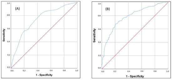 Finally, after performing multivariant logistic regression, our study provided a mortality risk assessment score with satisfactory efficiency based on the data available in the first hours of hospital admission. The initial model, which included SaO2 < 88.5%, IL-6 > 74.6 pg/mL, LDH > 804.5 U/L, and age > 69.5 years, based on a significance level of <0.05, had a C-index of 0.740 (Figure 1A and Figure 2A). However, implementing additional variables, based on a significance level of <0.09 (e-GFR, hsTnI, lymphocyte count, and serum creatinine), the C-index reached a maximum value of 0.785 (Figure 1B and Figure 2B).