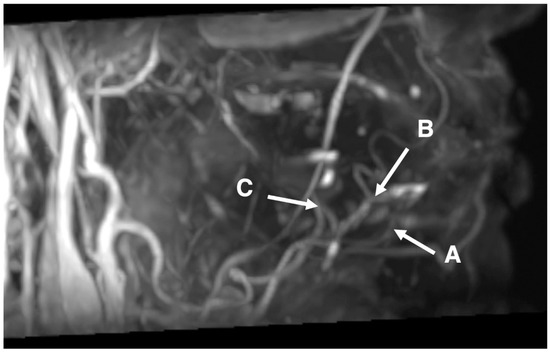 Image of 46-year-old male with left tongue carcinoma. Representative images of the submental, sublingual, and deep lingual arteries obtained by 3D MRA using SSFP with a time–SLIP. A: possible course of the submental artery around the area of the incisors; B: possible course of the sublingual artery around the incisors from premolar areas; and C: possible course of the deep lingual artery around the area of the molars.