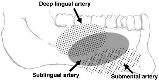 Alternatively, noninvasive magnetic resonance imaging (MRI) techniques, such as magnetic resonance angiography (MRA) without contrast medium, have been developed to identify and characterize peripheral blood vessels located in the thoracic, abdominal, lower extremity, head, and neck regions [8,9,10,11,12,13,14,15,16,17]. We have also conducted several studies regarding the delineation of peripheral blood vessels in the head and neck region [8,12,13]. In one of these, we reported non-contrast-enhanced MRA using steady-state free-precession (SSFP) with a time–spatial labeling inversion pulse (time–SLIP) as a highly useful technique for visualizing thin, main peripheral arteries in the oral and maxillofacial regions. This balanced SSFP technique provides a very high signal-to-noise ratio; a strong contrast between the blood vessels and tissue, such as muscle, can be obtained. Therefore, the time–SLIP technique can selectively depict arteries with good background signal suppression without using a contrast medium. Therefore, we speculated that MRA using SSFP with a time–SLIP could be used to visualize the submental, sublingual, and deep lingual arteries and elucidate their relationship to the mandible as a non-invasive examination prior to dental implantation. To the best of our knowledge, no report has investigated the course of branches of the lingual and facial arteries on the lingual side of the mandible using this MRA technique.