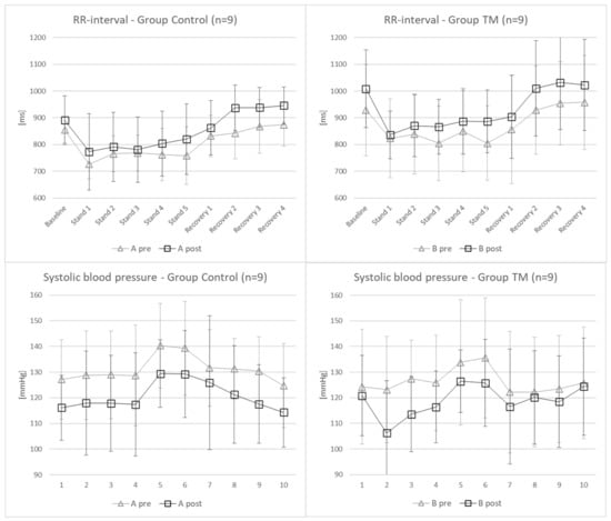 The results of the hemodynamic parameters are summarized in Table 2. Of note, analyses are based on log-transformed data, while raw data are reported. Significant changes from pre- to post- measurement were found for the SBP (p = 0.018) and RRI (p = 0.05) (Figure 2), while HR nearly missed significance (p = 0.058). Thus, SBP and HR decreased while RRI increased after 4 weeks of rehabilitation. However, no interactions between the groups were found. Significant differences between individual epochs are not reported here as these are obvious and well-known phenomena when standing up from a lying/supine position.