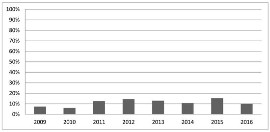 Gathering information about the patient’s coagulation status takes about five minutes [6] for each blood sample. Previous studies investigated the positive effect of ROTEM in relation to specific coagulation factor deficiencies [7,8], the reduction in blood transfusions [9], costs [10,11], and mortality [12] in cardiac surgery [13], liver transplantation [14], obstetrics [15,16], and trauma care [17]. However, more frequent use of ROTEM for early detection and management of coagulopathies would be desirable [10] as the average annual use of ROTEM was never higher than 20% over the period studied (Figure 1).