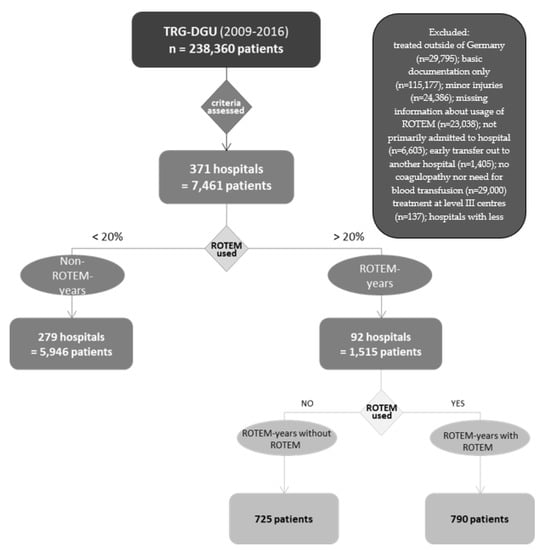 Related to these parameters, ROTEM years and Non-ROTEM years were compared. Additionally, ROTEM-year associated data were divided into two groups: one group in which the patients actually received ROTEM diagnostics (ROTEM years with ROTEM, n = 790) and one in which they did not receive it but were admitted to a centre in which ROTEM was usually used (ROTEM years without ROTEM, n = 725). The division of the groups can be observed in Figure 2.