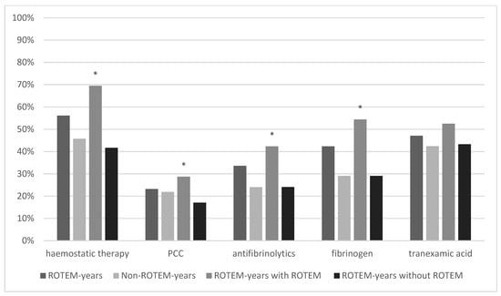Figure 3 illustrates the comparison of haemostatic therapy between ROTEM years, Non-ROTEM years, and ROTEM years with and without ROTEM. Differences in general haemostatic therapy, prothrombin concentrate (PCC), antifibrinolytics and fibrinogen were significant in comparison between ROTEM years with ROTEM and ROTEM years without ROTEM.
