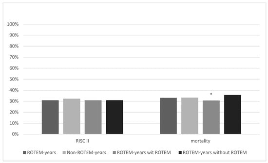 The probability of death according to RISC II was 30.8% in ROTEM years and 32.3% in Non-ROTEM years (p = 0.13; Figure 5). The observed mortality rate was similar in both groups (ROTEM years = 33.2% (503/1515); Non-ROTEM years = 33.0% (1962/5946; p = 0.86) and higher than estimated. The difference between the observed versus predicted mortality within one group was +2.4% in ROTEM years and +0.9% in Non-ROTEM years. In ROTEM years with ROTEM use, the average predicted probability to die by RISC II was 30.8% and the observed mortality rate was 30.6% (242/790; difference: −0.2%). An average probability to die of 30.8% and an actual mortality rate of 35.6% (258/725, difference: +4.8%) were achieved in ROTEM years without ROTEM use. Thus, the mortality rate of patients in ROTEM years with ROTEM use was significantly lower than in ROTEM years without ROTEM use (difference: −5.0%, p = 0.043) and even the lowest in all groups.