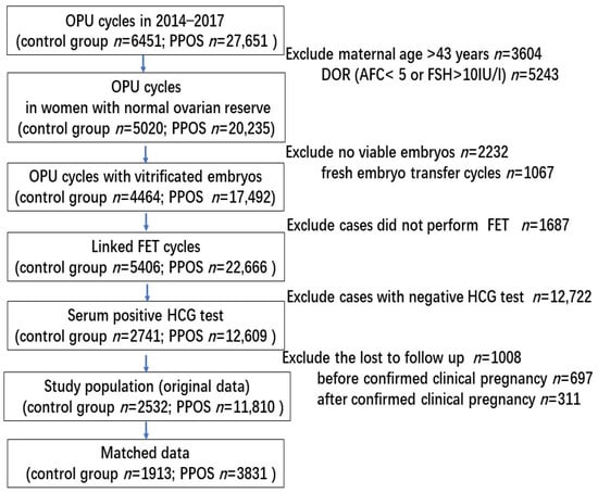 A total of 11,810 positive hCG cycles with embryos originating from PPOS and 2532 cycles originating from conventional GnRH analogue protocols were enrolled from January 2014 through December 2017. The screening procedure is shown in Figure 1.