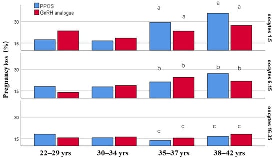 The incidence of pregnancy loss was stratified by maternal age and the retrieved oocytes. Different letter means significant difference among the subgroups of different oocyte yields (p < 0.05).