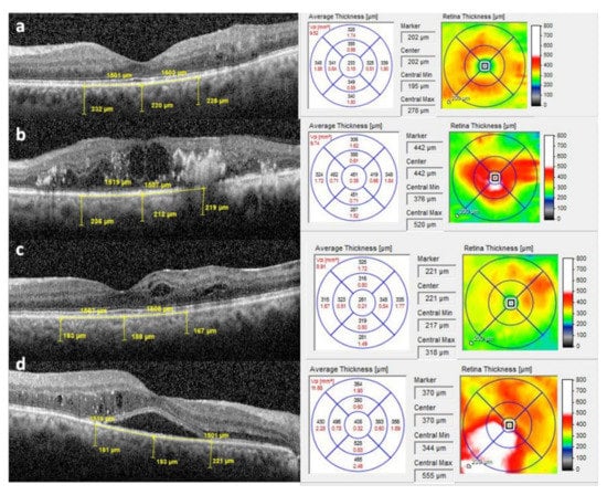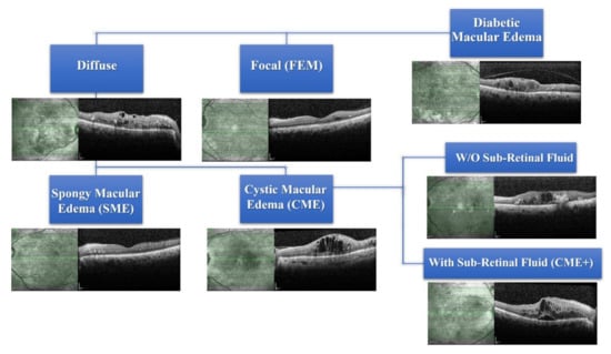 Subtypes of DME were diagnosed according to the criteria reported by ETDRS by observing the patient’s medical record, multicolor fundus photos, and automated retinal thickness maps on SD-OCT scans [,]. Edema was classified into focal macular edema (FME) or DME. The diffuse macular edema was further divided into cystic macular edema (CME) and spongy macular edema (SME). CME is involved in eyes without (W/O) subretinal fluid (SRF) and with SRF. Amongst the eyes with CME, the presence of subretinal fluid (SRF) was labelled a “+” sign, i.e., CME+ (Figure 1). Macular volume (MV) and central retinal thickness (CRT) were also recorded in all eyes included in the study.